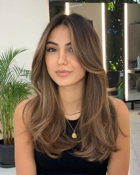 Why it flatters: This cut elongates the face and softens width at cheeks. Long layers move vertically and diagonally. Face-framing begins at or below the chin to slim.